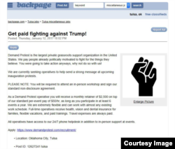 В начале января в разных городах Америки на сайте частных объявлений Backpage появилось объявление под заголовком: "Заработай на борьбе против Трампа!"