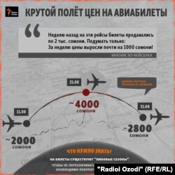 Рост цен подтвердили в офисах по продаже авиабилетов. В частности, в авиакассах сообщили, что в настоящее время авиабилет на рейс Душанбе-Москва превышает 4 тыс. сомони (более $400) и такое повышение стоимости авиабилетов связано с ростом пассажиропотока накануне начала учебного года.