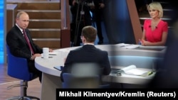 Президент России Владимир Путин отвечает на вопросы россиян на прямой линии в эфире государственных каналов. Вопросы главе государства присылают заранее, также поступают звонки в прямом эфире. Первую прямую линию с Путиным провели в 2001 году, нынешняя – семнадцатая по счету.